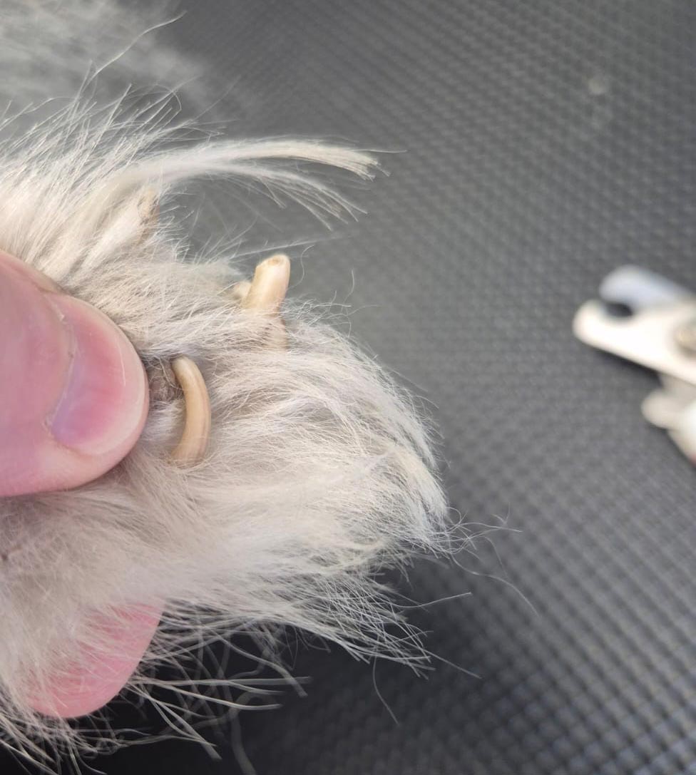 Si l’ergot est très long, mieux vaut éviter de couper trop court d’un seul coup : la partie vivante (la veine) peut être descendue, et une coupe brusque devient douloureuse et saigne facilement. La solution la plus sûre est une coupe progressive (un peu à la fois, sur plusieurs séances) ou une coupe en salon, pour retrouver une longueur confortable sans risque. En attendant, surveillez surtout qu’il ne se recourbe ou ne commence à rentrer dans la peau.